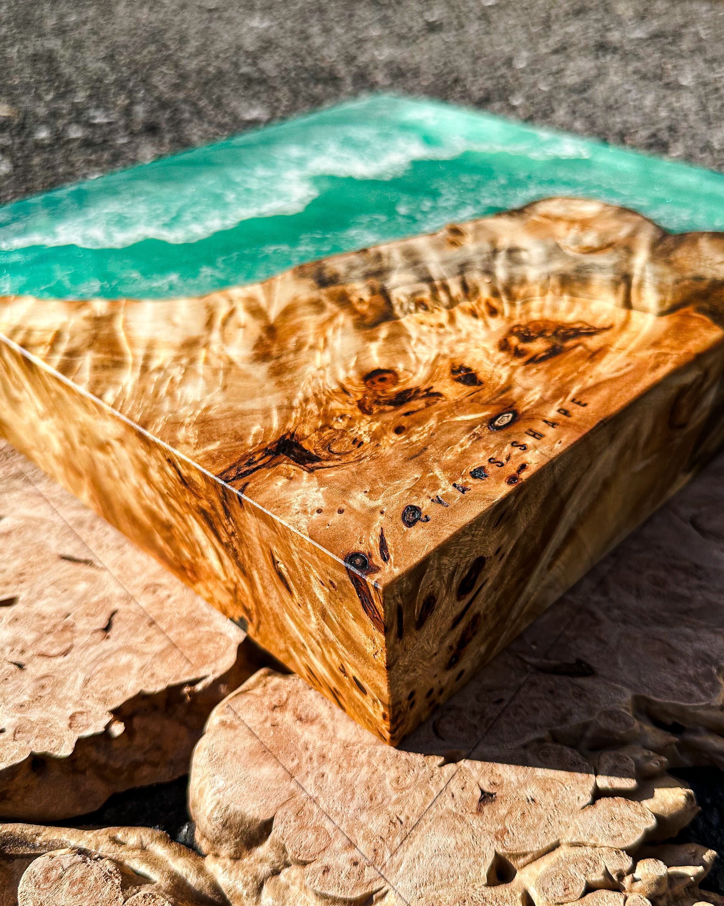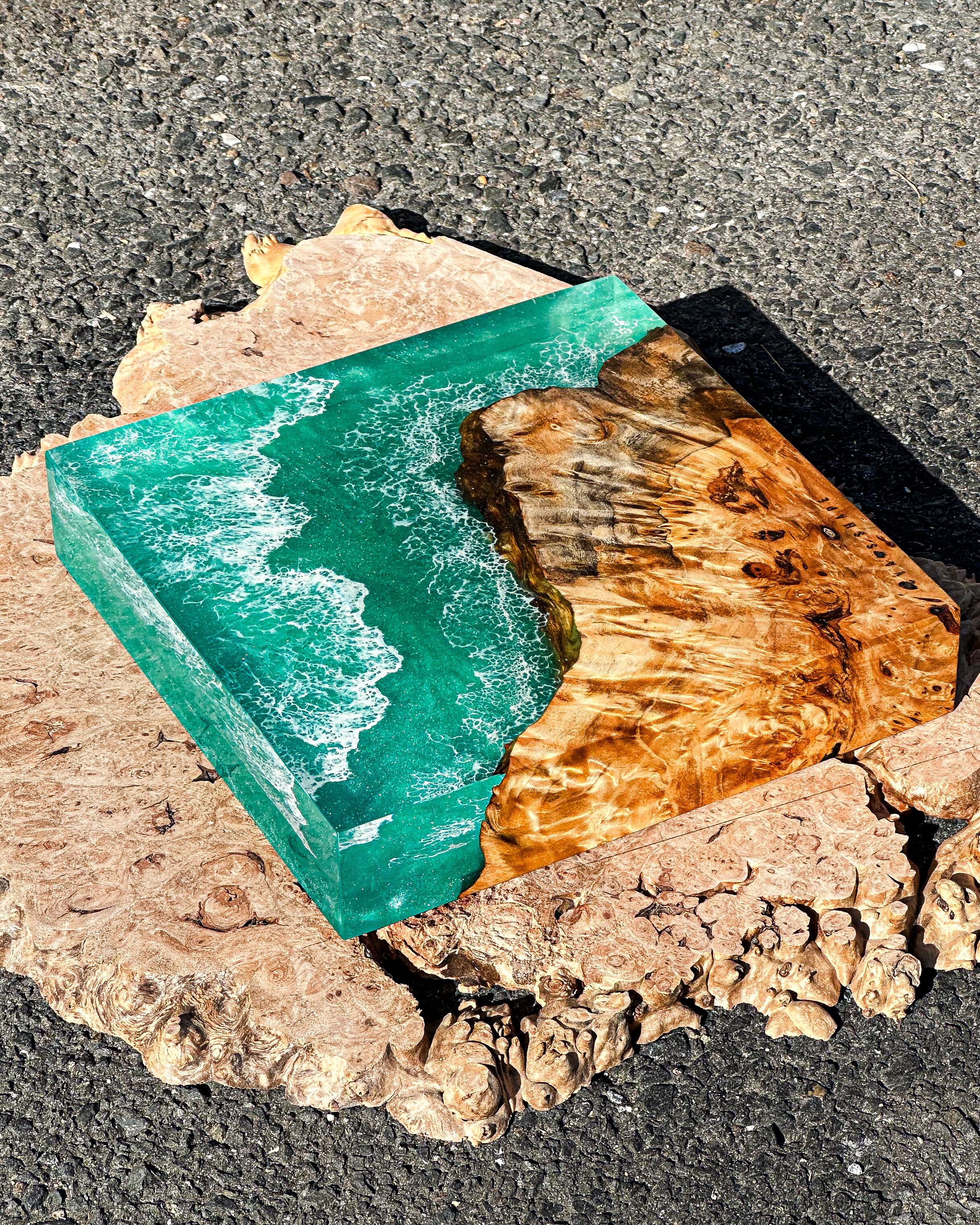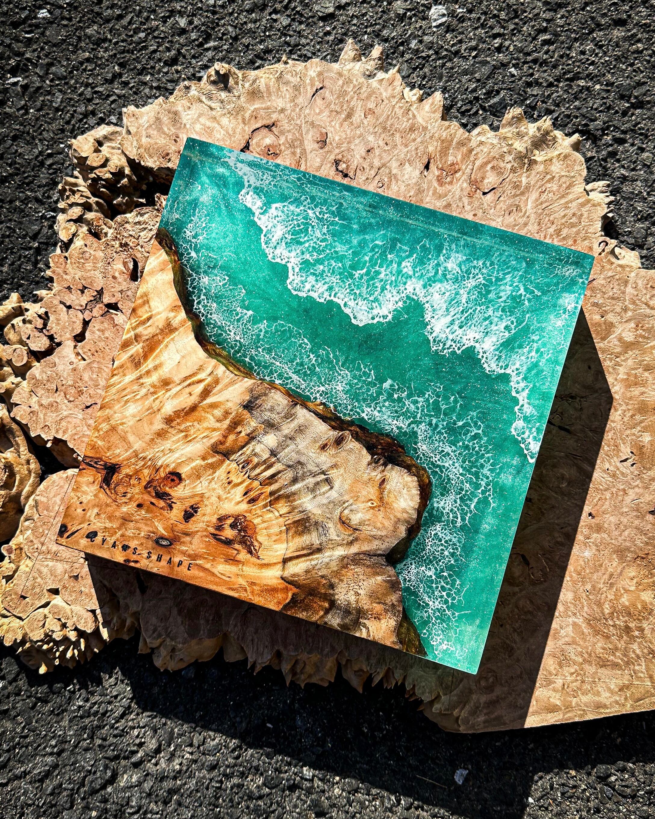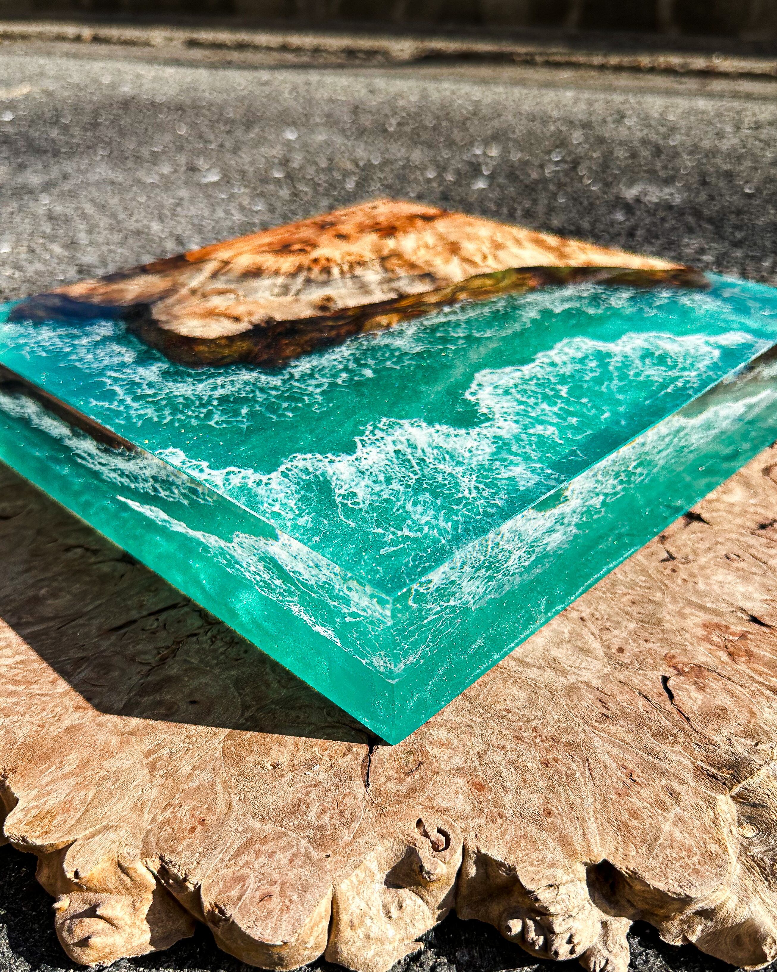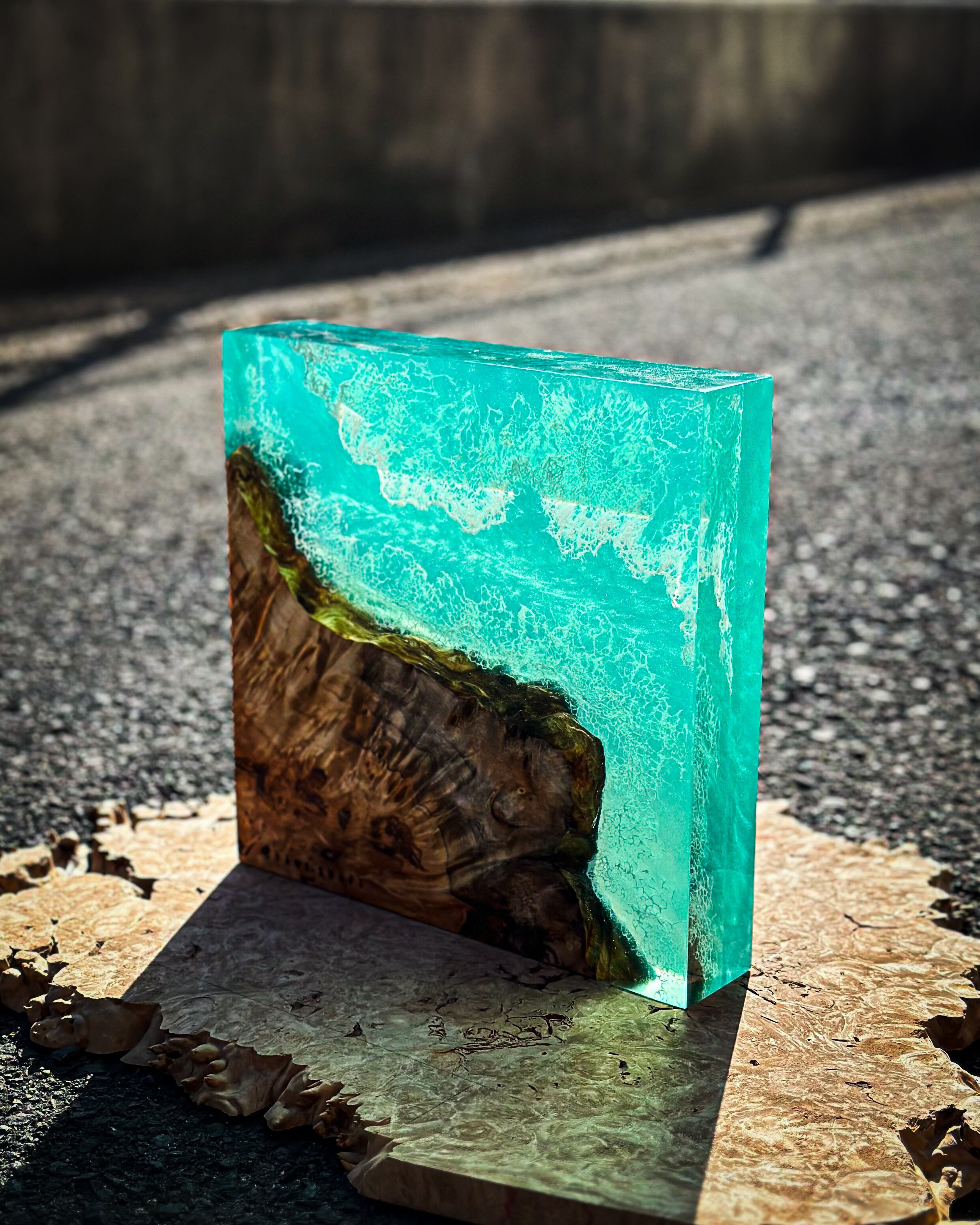 まるで海を潜ったような景色が広がるCubeは光の加減と共に色を変え、見る人それぞれの想像を爆る。作品を立てて光を楽しみ寝かせて深い海に潜ってみるのも。日常の中でアートとして、またオブジェとしても楽しめるようなこの作品に心を浸してみては。